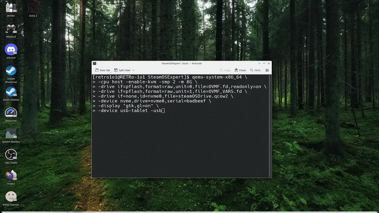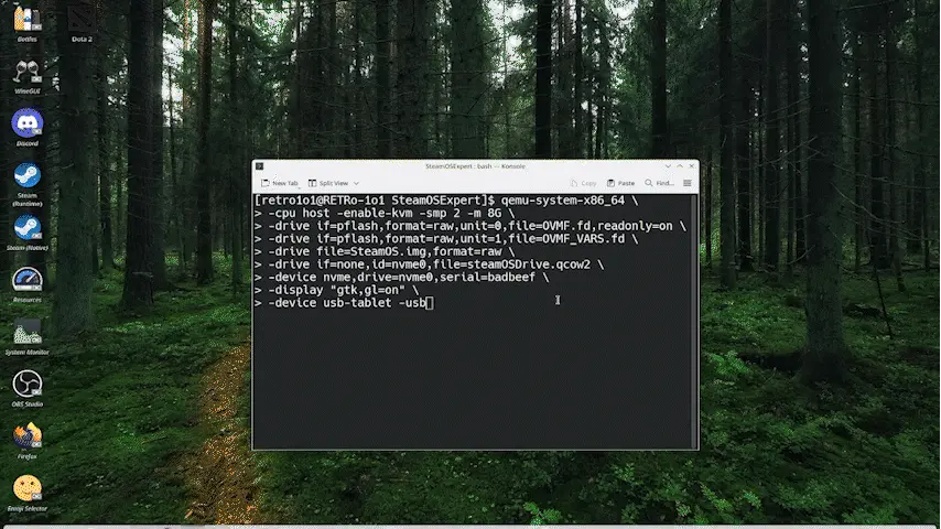 Now that the installation is complete, we can remove the SteamOS-Recovery.img flag from the QEMU run command since it is no longer needed. Run QEMU again with the updated command for booting into SteamOS: