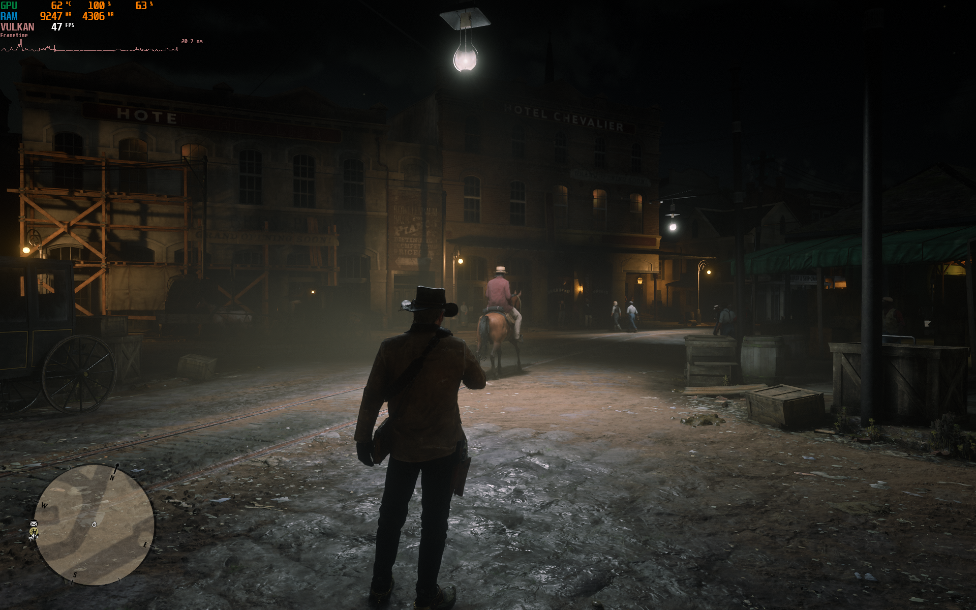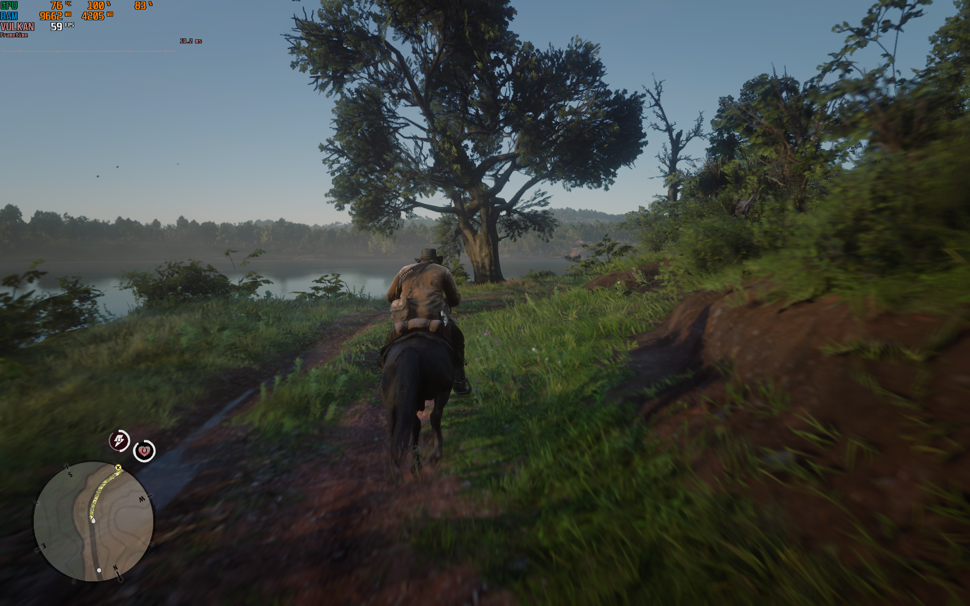 On Windows, I run RDR2 with High Textures and everything else on Medium, using the Vulkan graphics API. It barely holds 60 FPS. In high-density areas like Saint Denis or Strawberry, it drops to around 40-45 FPS. Traveling across the map, it mostly stays in the mid-to-high 50s, occasionally hitting 60 but rarely staying there.
